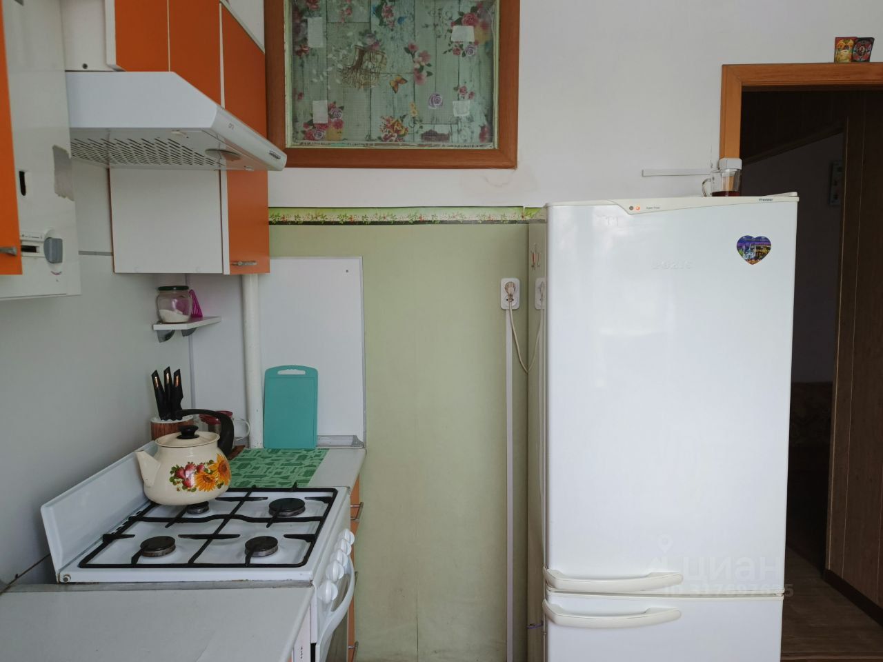 Из техники есть: холодильник, плита, вытяжка, микроволновая печь, чайник, телевизор, стиральная машина автомат, утюг.