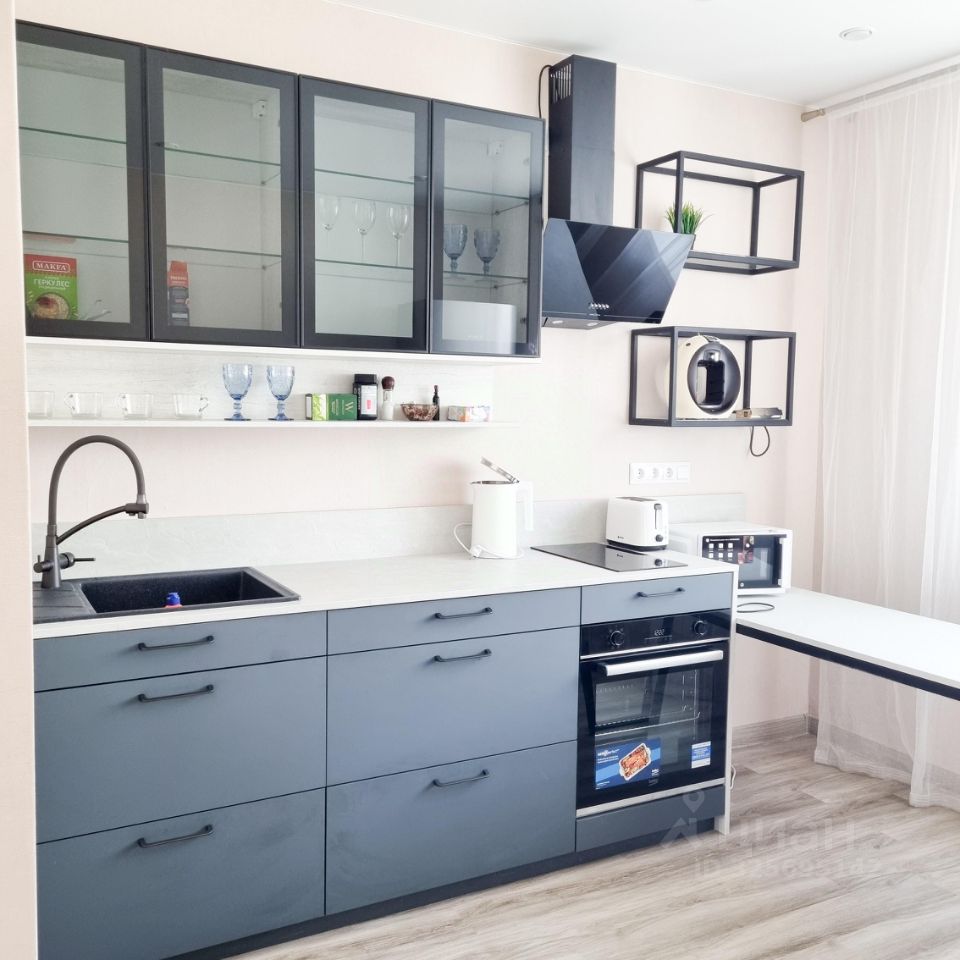 Большая просторная кухня. В квартире из необходимой мебели и техники имеется: кондиционер, холодильник, плита, микроволновка, стиральная машина, кофемашина, телевизор, утюг, чайник, стол, диван, кровать.