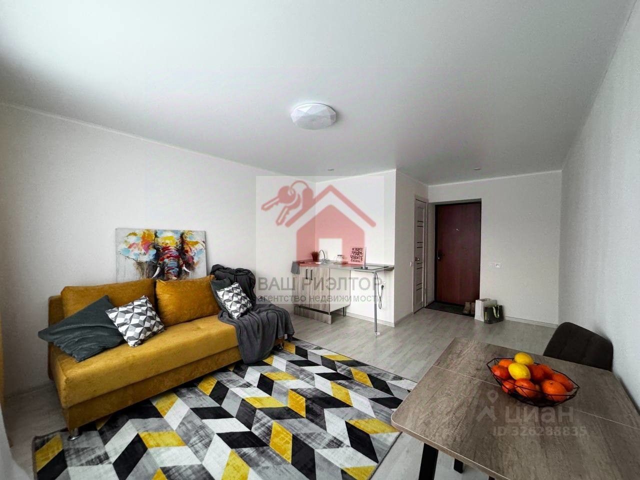 Полная комплектация: Кухонные шкафы, удобный диван, место под стиральную машину, ТВ и шкаф.