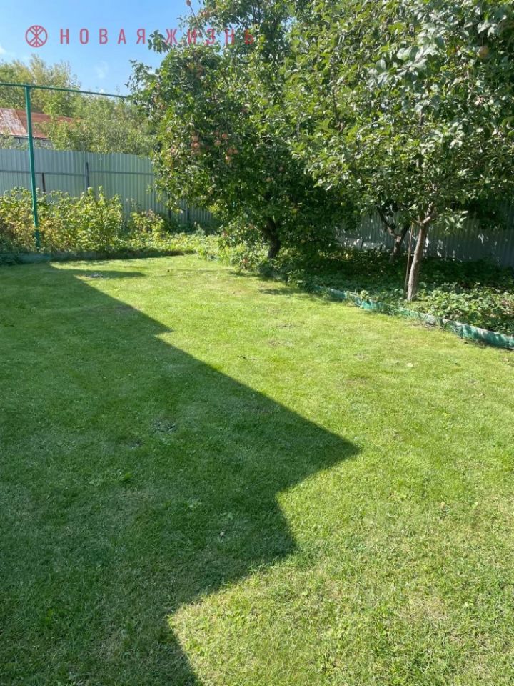 Участок облагорожен, металлический забор, плитка на участке, плодовые деревья, газон.