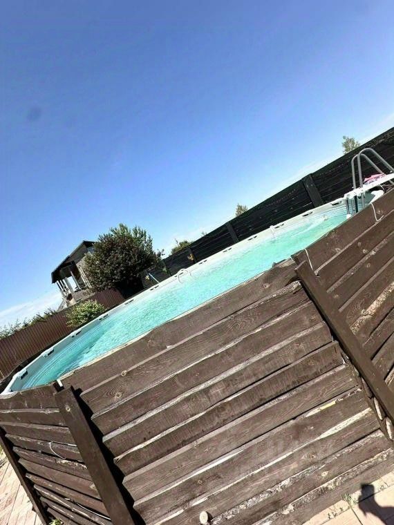 На территории участка : дом двухэтажный, баня , бассейн и хозблок.